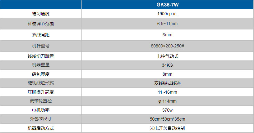 GK35-7W全自動(dòng)雙針?biāo)木€高速封包機(jī)采用雙機(jī)針縫合,一次縫兩趟線,牢固可靠,可實(shí)現(xiàn)無泄漏封包,適合于對(duì)縫口有嚴(yán)格要求的廠家對(duì)紙袋、塑編袋、布袋等的封包縫口。采用 光電開關(guān)自動(dòng)控制啟停機(jī)、電控氣動(dòng)式切刀自動(dòng)剪切線辮,適合于自動(dòng)化程度較高的化工廠、倉庫、碼頭等流水線縫包。